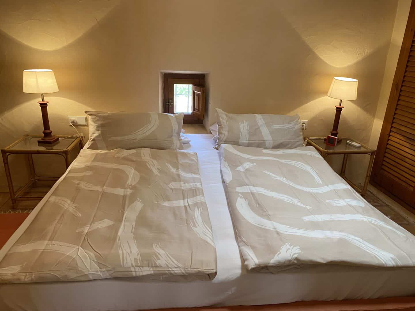 Helles Schlafzimmer in der Finca Can Forca Ibiza mit zwei Betten, gemütlicher Atmosphäre und stilvoller Einrichtung für einen entspannten Urlaub.